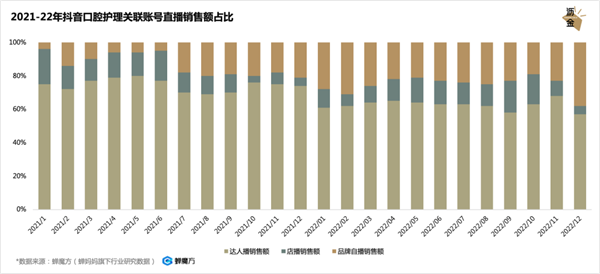 再来看看品牌销量的主要来源。去年开始,口腔护理市场来自品牌自播和店播的销售额显著增加,达播的占比有所下滑。