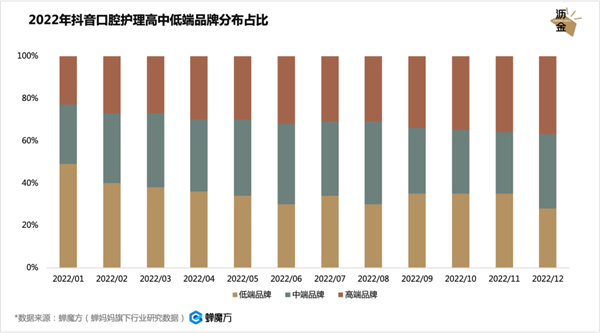 可以看到,2022年Q1,低端品牌在抖音的口腔护理市场仍占据较大比重,高端品牌占比不足30%。