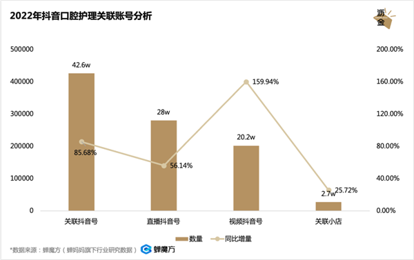 伴随口腔赛道涨势迅猛,抖音的关联账号数和内容数量也迎来增长高峰。2022年,口腔护理关联抖音号数达到42.6万个,增幅85.86%;而直播抖音号数达到28万个,同比增幅56.14%。