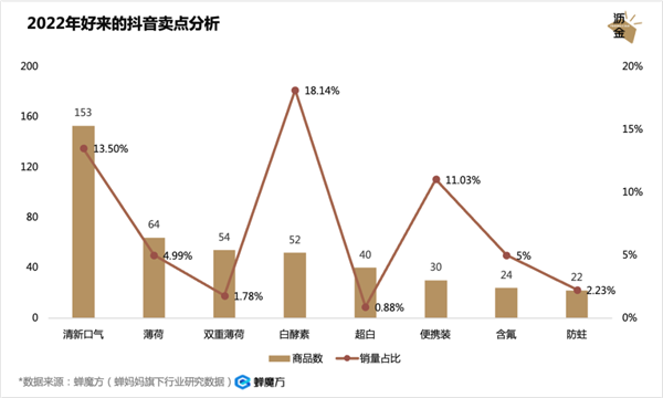 从卖点分析,好来主打形象管理的痛点,其中清新口气概念的产品销售额占比达到13.5%。