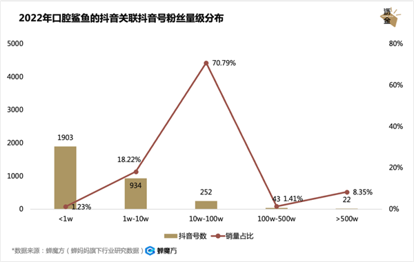 2022年口腔鲨鱼的抖音关联抖音号粉丝量级分布