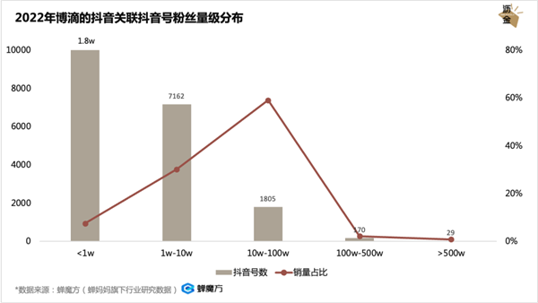 在抖音一侧的合作上,10-100万、1-10万粉丝的账号为品牌提供了大多数的销售额,分别占比64.45%和23.12%。