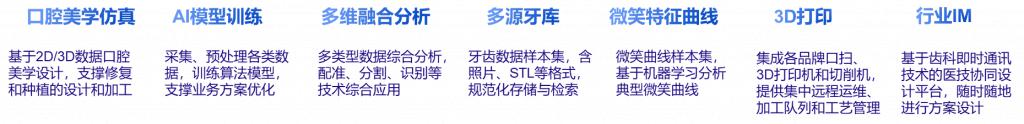 集成数字化平台包括了口扫、CBCT 等数据的采集、预处理、综合分析、人工智能分割识别、图形图像处理、点云模型处理、设备互联、医技沟通等技术。